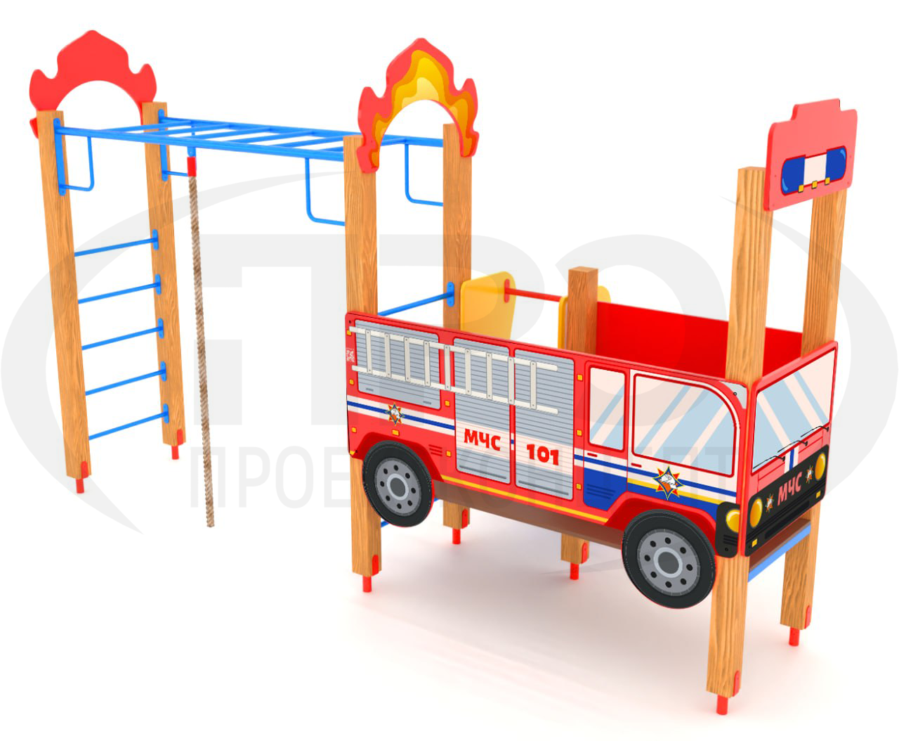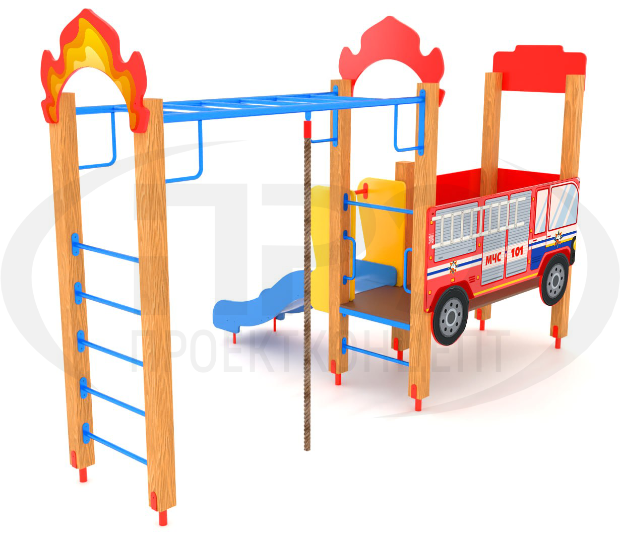 Материалы: металл в порошковом окрашивании, влагоустойчивая фанера в заводском окрашивании, противоскользящая фанера, брус деревянный технической сушки, единый лист нержавеющей стали, канат полипропиленовый, пластиковые заглушки и колпачки, оцинкованные метизы. Способ крепления — бетонирование.